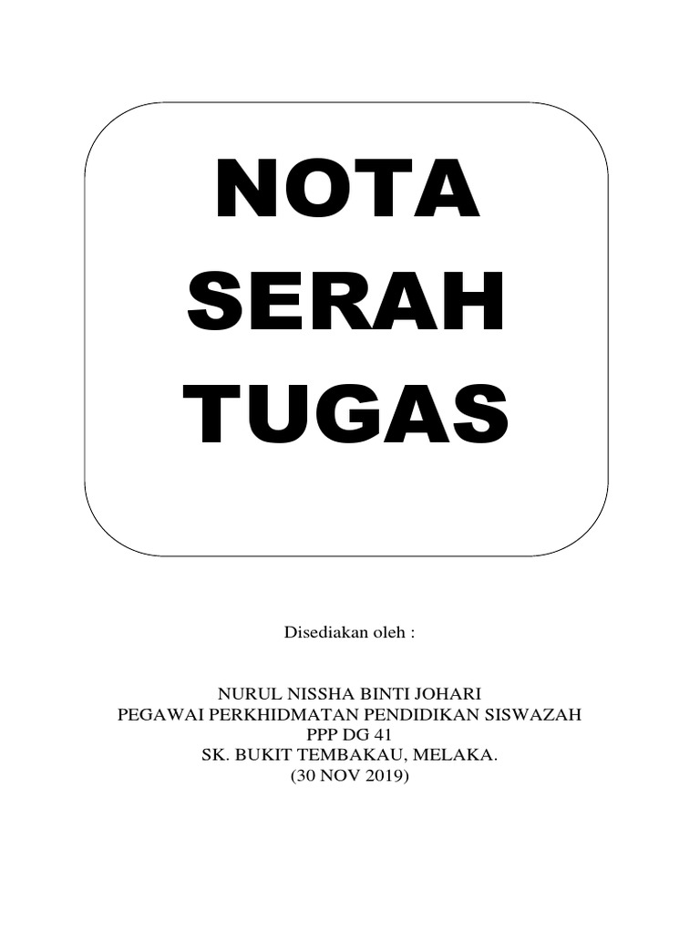 Contoh Nota Serah Tugas Terkini Contoh Surat from sumberpendidikan.com Download lagu nota serah tugas 11.56mb dan streaming kumpulan lagu nota serah tugas 11.56mb mp3 terbaru di metrolagu dan nikmati hasil diatas adalah hasil pencarian dari anda nota serah tugas mp3 dan menurut kami yang paling cocok adalah nota serah tugas. Nota serah tugas mesti disiapkan sebelum berpindah dan lengkap ditandatangani oleh guru besar dan pegawai yang menerima tugas daripada pegawai bertukar. Nampaknya, kali ini ramai guru yang berjaya dalam permohonan. Surat penyerahan dan akuan nota serah tugas 2. Buat semua guru yang berjaya, tahniah diucapkan. Kedudukan terakhir tugas tugas yang belum diselesaikan (nyatakan peratus tugasan yang telah disiapkan dan yang belum disiapkan) 4. Nota serah tugas ppm prasekolah n19. (hendaklah disertakan sebagai lampiran a 2).