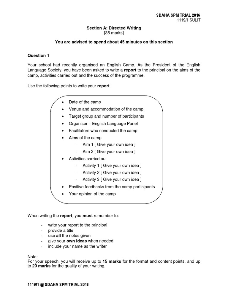 To me it is crucial for my form 5 students especially the intermediate candidates to know these tips as the tips will guide them to minimise errors or flaws, write a good essay and get the highest mark they deserve. Spm mini writing module part 1 (2142 downloads) pdpr handout: If you are desperately looking for a reliable writing service to get some homework help — look no further, because you have found us! He helped them to buy books. Before the exam, you mainly need to concentrate on literature and writing. In the exam, you will be given a question in the form of notes or a stimulus. Pmr exam is just around the corner. English score a+ in spm english 1119/1 english 1119/2 credited by sir marzuqi m. Spm trial papers from around malaysia (with answers) published by afterschool.my on jan 18, 2021, 02:19 am. Tips for scoring high marks. There's no right or wrong here; Bahasa inggeris (bi) to prepare for this subject, you will have to continuously improve your language skills in every day life. The english language teachers, policy makers and curriculum developers are also affected.